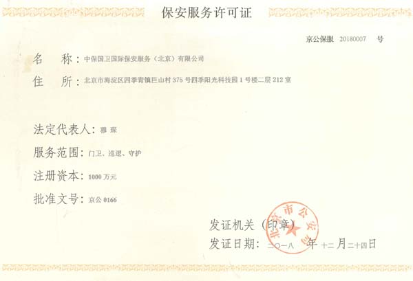 中保國衛(wèi)國際保安服務(北京)有限公司,屬中保國衛(wèi)集團旗下子公司。能全方位的為大型客戶提供優(yōu)質的安保、押運服務,是集人防和技防于一體的新型正規(guī)化綜合安保押運服務企業(yè),提供人防、物防、技防、聯(lián)網(wǎng)報*、非武裝押運等安防相關的一站式服務。